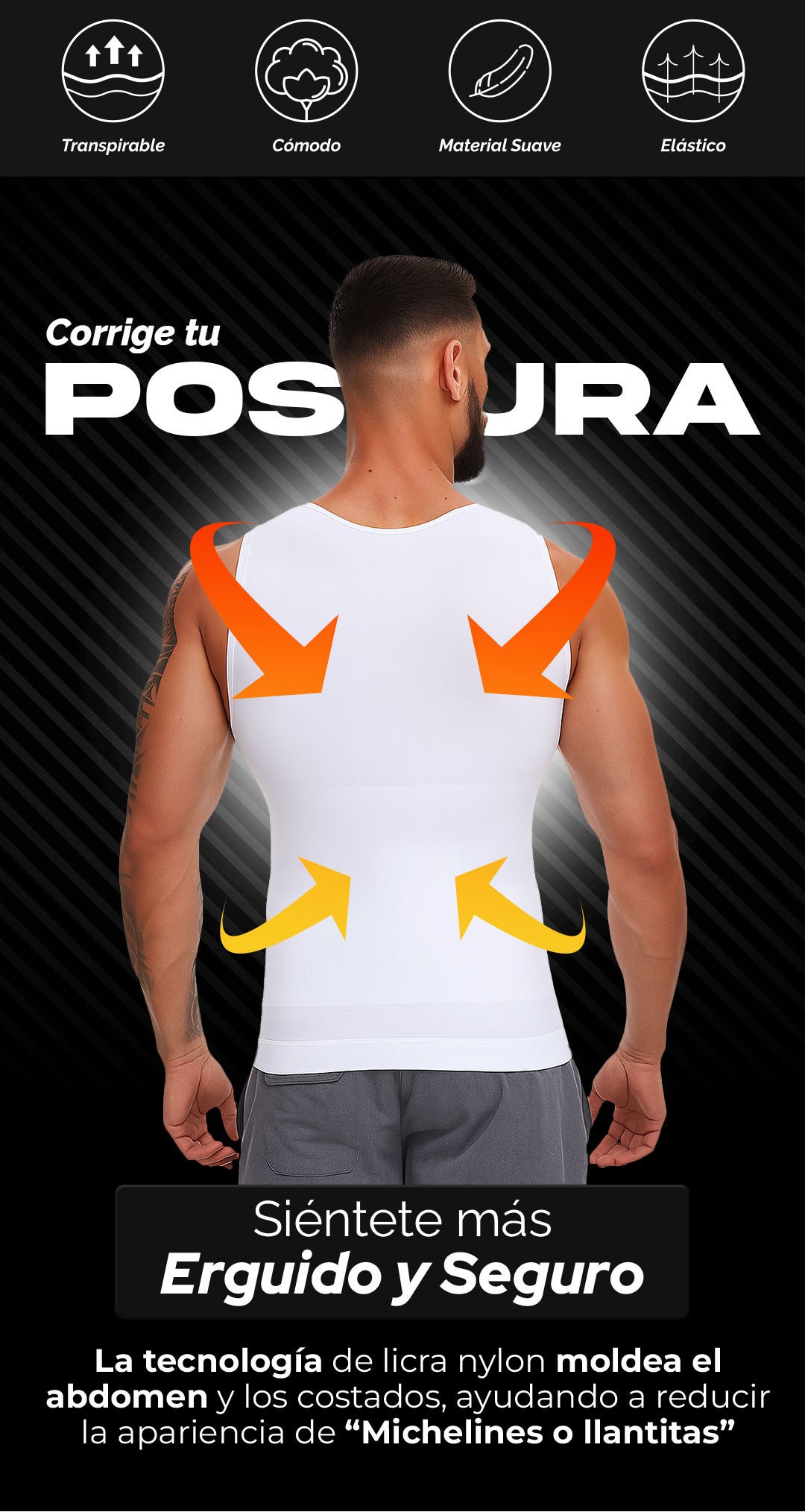 Tela de doble capa: Somos los únicos que utilizamos el doble de tela en comparación con la ropa moldeadora masculina estándar, lo que garantiza resultados superiores.