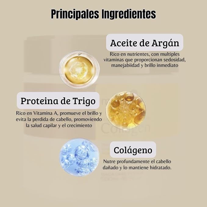 Ingredientes activos: Colágeno, Aceite de Argán, Proteína de Trigo